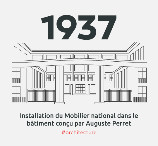 Le Mobilier national est installé depuis 1937 dans un bâtiment construit par Auguste Perret sur les anciens jardins de la Manufacture des Gobelins.